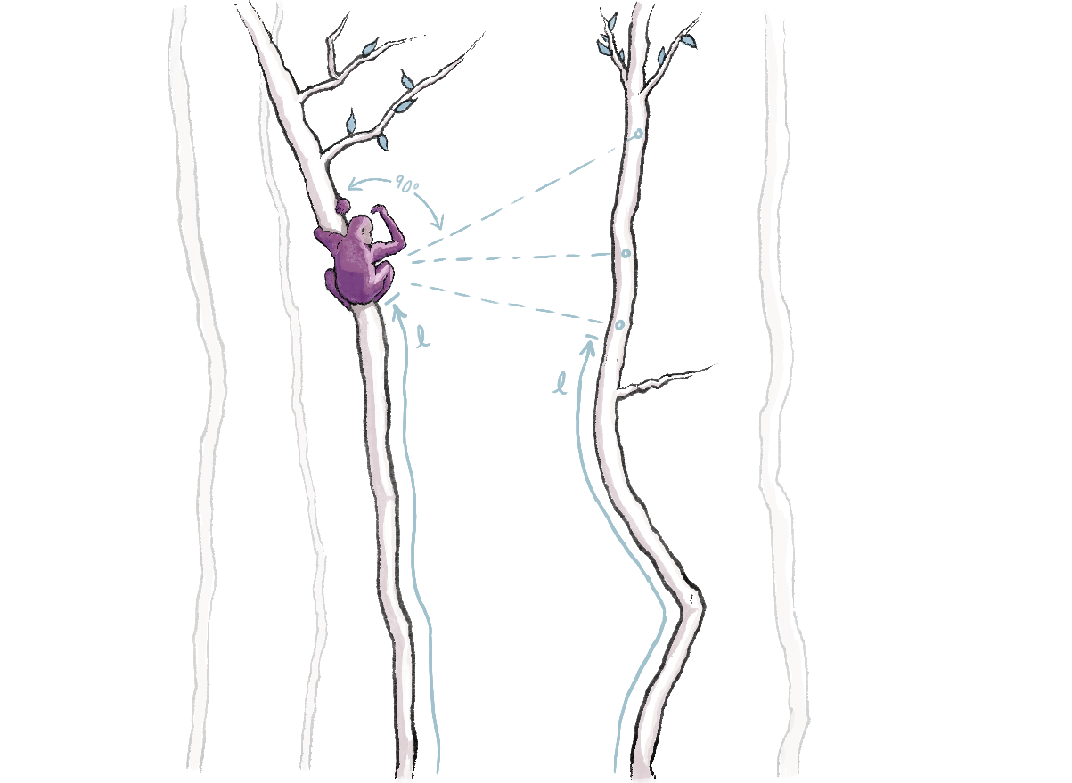 Assume Ehresmann the monkey is at the point $q \in \mathcal E$. The space of all the directions in which he could jump constitute the tangent space, $T_{q}\mathcal E$. The vertical subspace $\text{Ver}_q\mathcal E$ is all the directions that keep Ehresmann on the same tree. It is precisely the vectors $v$ that satisfy $d\pi_q(v)=0$; these directions do not change Ehresmann’s coordinates as measured along the ground. The vertical subspaces, collectively called the vertical subbundle $\text{Ver}\mathcal E$, are well-defined as soon as we define a principal bundle.