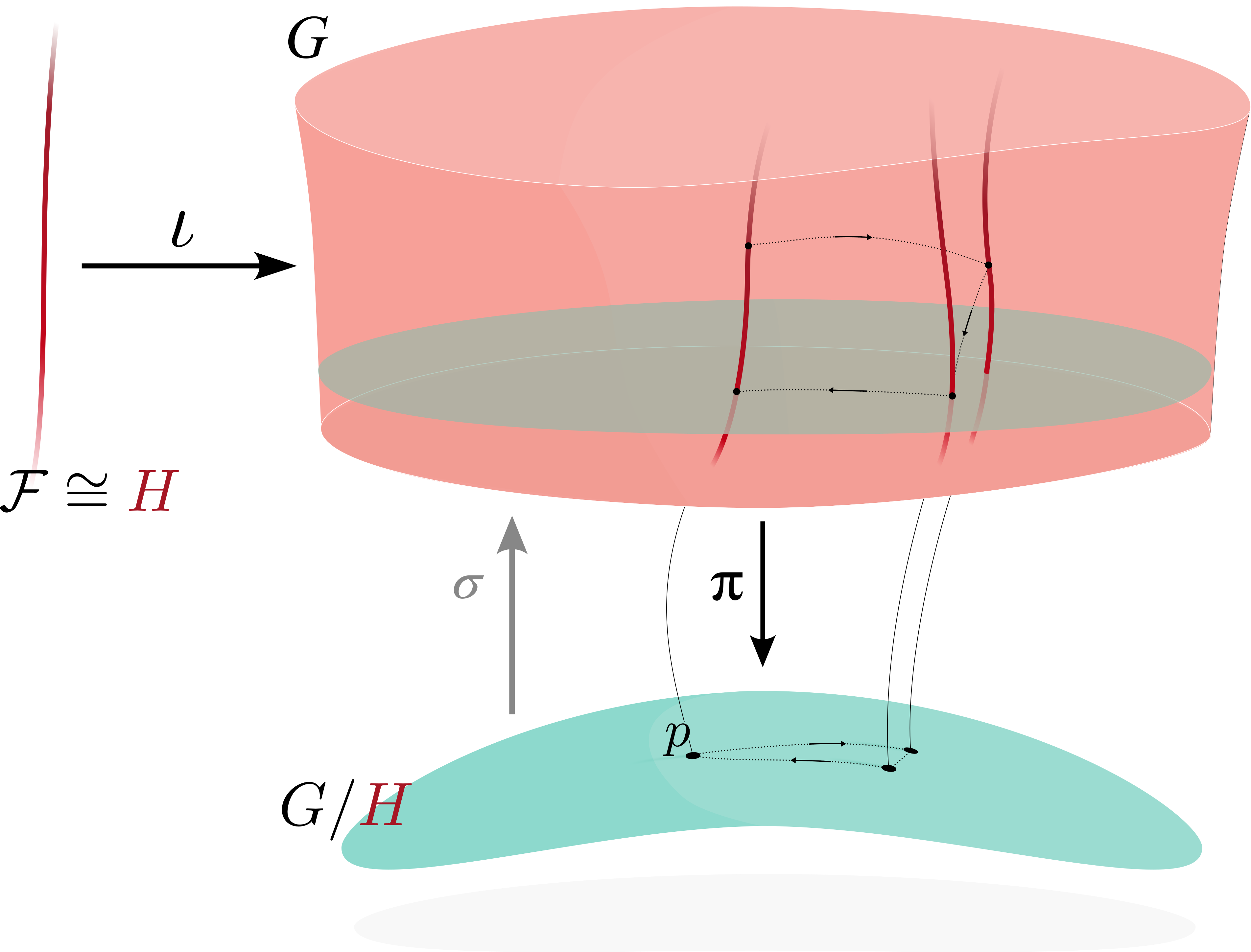 which is that of a principal $H$-bundle. The map $\pi$ sends $g\in G$ to the point $g \cdot p_0$, and we observe that $\pi(g)=\pi(gh)$ for any $g\in G$ and $h\in H$. We define a section (think cross-section) of this bundle to be a map $\sigma$ that is a right-inverse of $\pi$, i.e., $\pi \circ \sigma=\mathrm{id}_{G/H}$ is the identity map on $G/H$.1