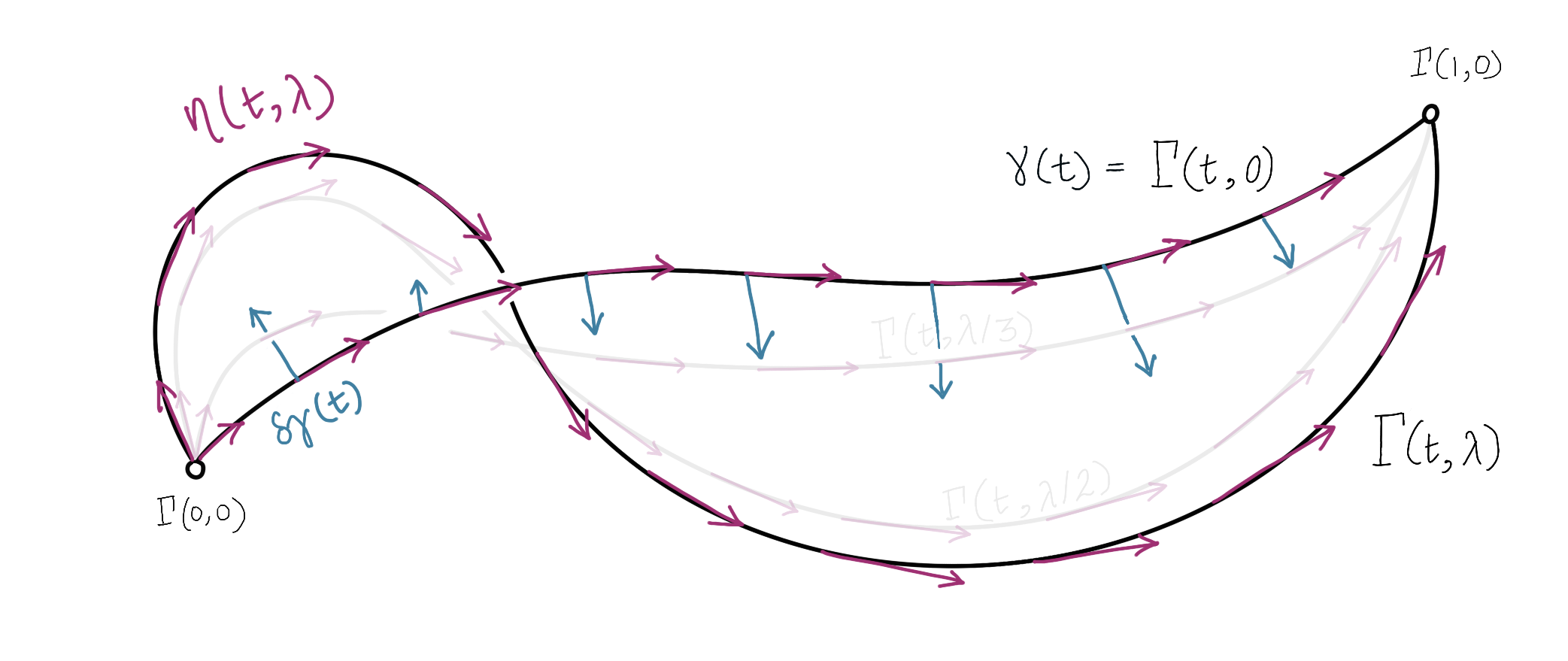 $$ \dot\Gamma(s,\lambda) \coloneq \frac{\partial}{\partial t} \Gamma(t, \lambda)\Big\rvert_{t=s} = \eta^i(s, \lambda)\overline E_{i,\Gamma(s,\lambda)}.$$Since $\Gamma(\hspace{1pt}\cdot\hspace{1pt},\lambda)$ coincides with $\gamma$ at $\lambda=0$, we have the compatibility condition $\eta^i(t,0)=\eta^i(t)$.